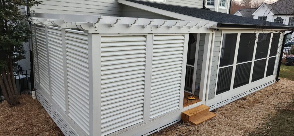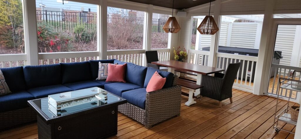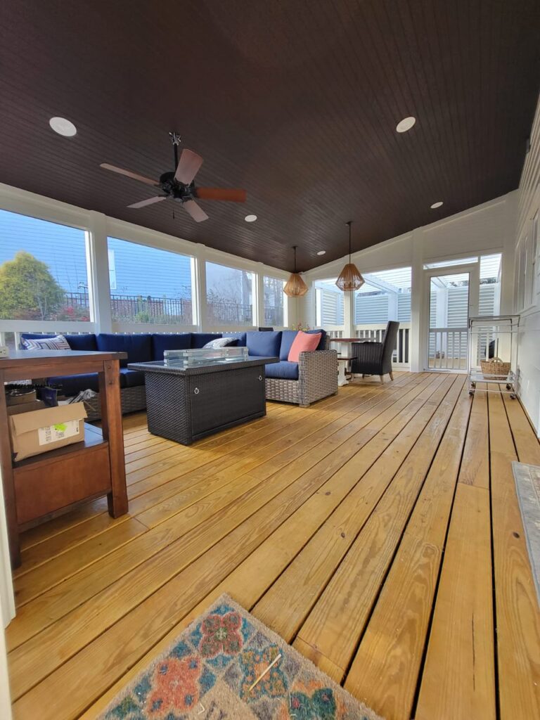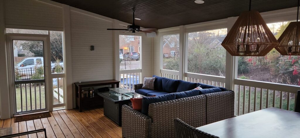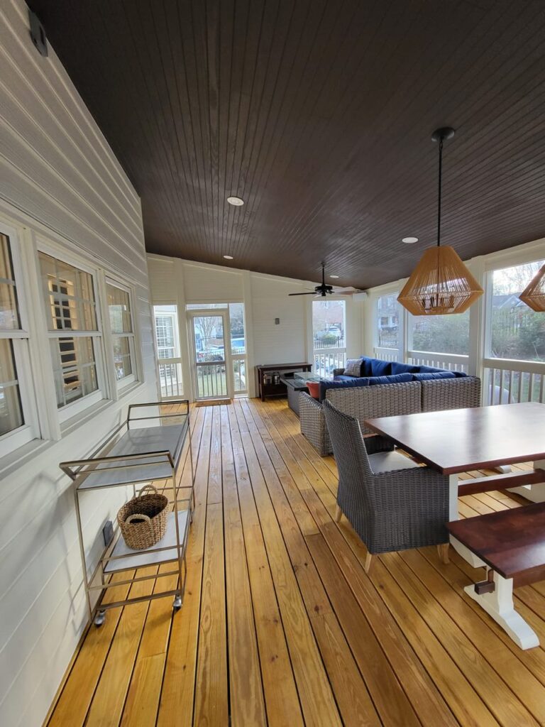 The transformation is remarkable. What was once bare earth is now a beautifully finished screened-in porch featuring warm wood decking, elegant white trim, and a modern roofline that complements the home’s architecture. Inside, we created a cozy retreat complete with comfortable wicker furniture, pendant lighting, and a dining area perfect for entertaining. The new space blends indoor comfort with outdoor living, offering year-round enjoyment with protection from the elements.